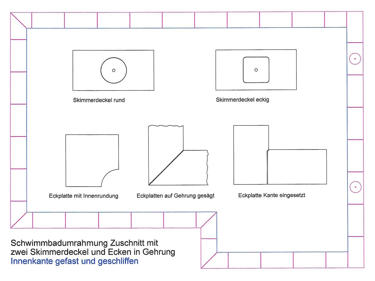 Wir machen nicht nur Zuschnitte mit bearbeiteten Kanten, wir machen auch jede Art von Formschnitte oder Ausschnitte. Skimmerausnehmungen, Schlitze, Bohrungen und Ausklinkungen sind mit unseren Maschinen kein Problem.