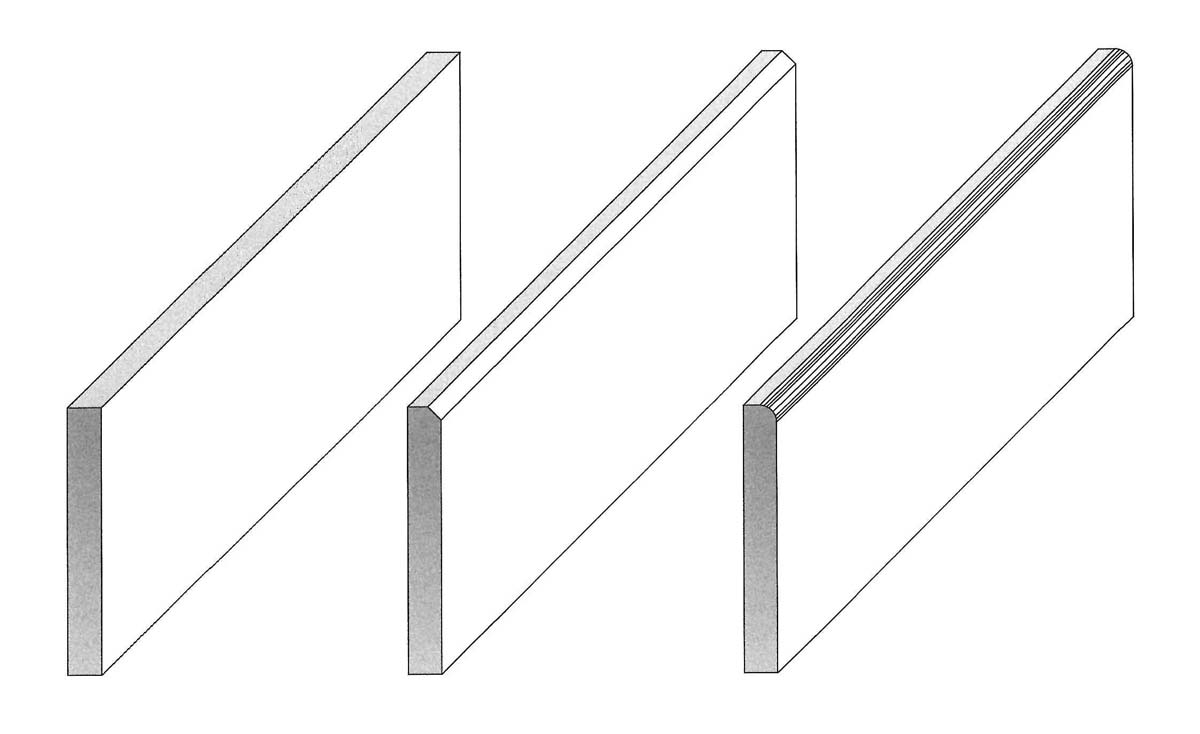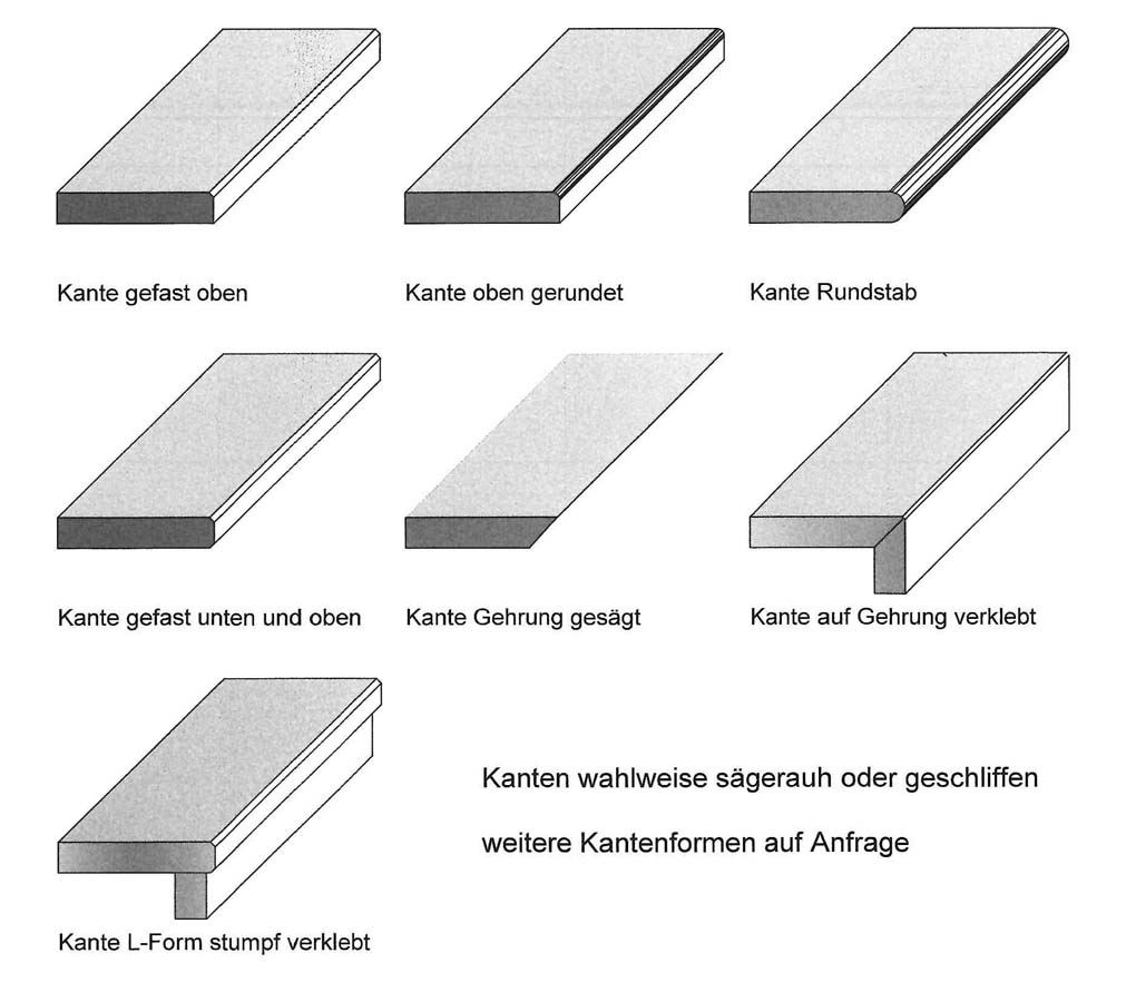Kantenbearbeitung von Keramikplatten können in unterschiedlichen Ausführungen hergestellt werden. Von der geschliffen gefasten Kantenbearbeitung bis zur Schenkelverklebung auf Gehrung.
